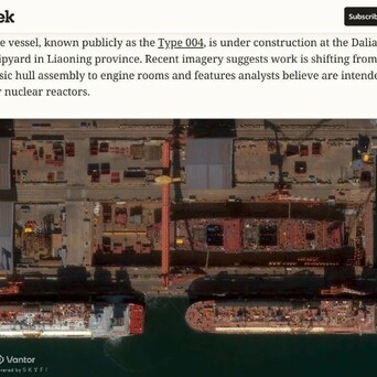 【美媒:基本可以确定东大新航母采用了核动力!】据美国《新闻周刊》(Newsweek)网站的报道称,根据SkyFi提供的此前2月17日的卫星图像显示,东大第四艘航母建造进展十分迅速,并且可以看到船体内部疑似出现了两个屏蔽的反应堆舱以及四个机舱。